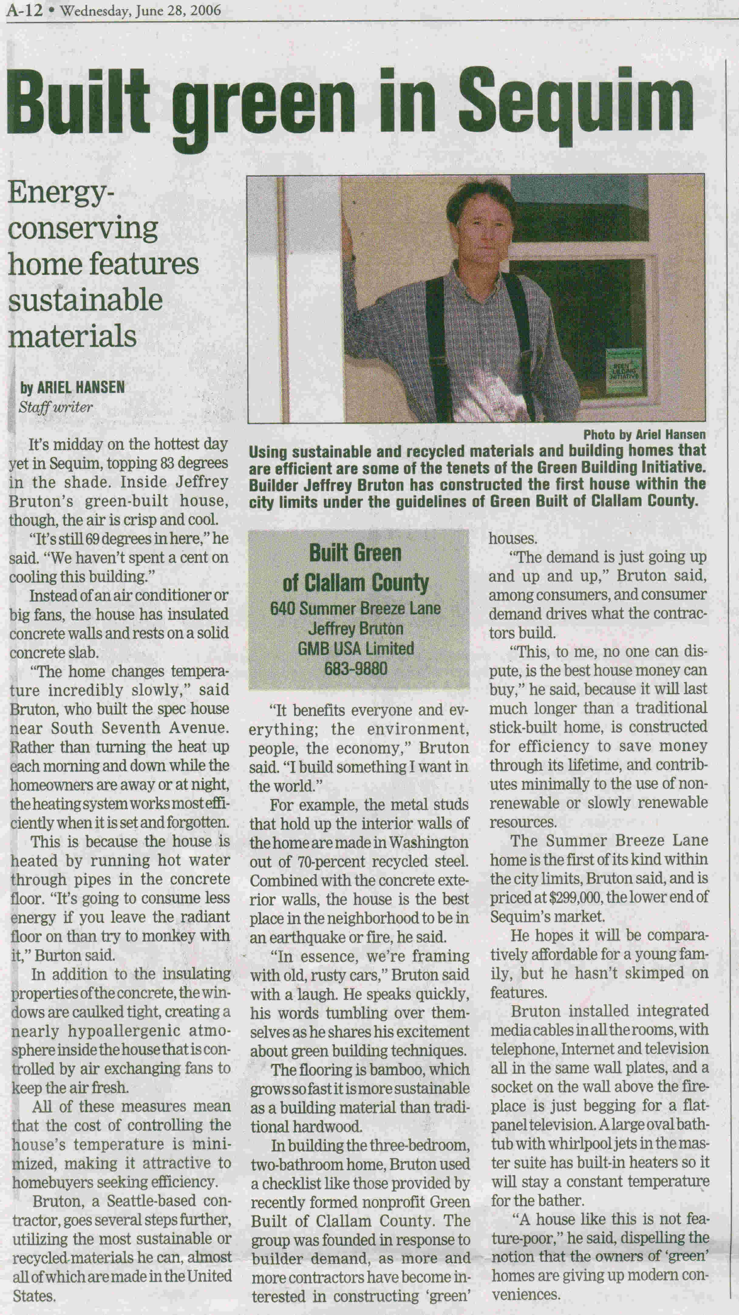Built green in Sequim Energy-conserving home features sustainable materials by ARIEL HANSEN ~ Staff writer It’s midday on the hottest day yet in Sequim, topping 83 degrees in the shade. Inside Jeffrey Bruton’s green-built house, though, the air is crisp and cool. “It’s still 69 degrees in here,” he said. “We haven’t spent a cent on cooling this building.” Instead of an air conditioner or big fans, the house has insulated concrete walls and rests on a solid concrete slab. “The home changes temperature incredibly slowly,” said Bruton, who built the spec house near South Seventh Avenue. Rather than turning the heat up each morning and down while the homeowners are away or at night, the heating system works most efficiently when it is set and forgotten. This is because the house is heated by running hot water through pipes in the concrete floor. “It’s going to consume less energy if you leave the radiant floor on than try to monkey with it,” Bruton said. In addition to the insulating properties of the concrete, the windows are caulked tight, creating a nearly hypoallergenic atmosphere inside the house that is controlled by air exchanging fans to keep the air fresh. All of these measures mean that the cost of controlling the house’s temperature is minimized, making it attractive to homebuyers seeking efficiency. Bruton, a Seattle-based contractor, goes several steps further, utilizing the most sustainable or recycled-materials he can, almost all of which are made in the United States. “It benefits everyone and everything; the environment, people, the economy,” Bruton said. “I build something I want in the world.” For example, the metal studs that hold up the interior walls of the home are made in Washington out of 70-percent recycled steel. Combined with the concrete exterior walls, the house is the best place in the neighborhood to be in an earthquake or fire, he said. “In essence, we’re framing with old, rusty cars,” Bruton said with a laugh. He speaks quickly, his words tumbling over themselves as he shares his excitement about green building techniques. The flooring is bamboo, which grows so fast it is more sustainable as a building material than traditional hardwood. In building the three-bedroom, two-bathroom home, Bruton used a checklist like those provided by recently formed nonprofit Green Built of Clallam County. The group was founded in response to builder demand, as more and more contractors have become interested in constructing ‘green’ houses. “The demand is just going up and up and up,” Bruton said, among consumers, and consumer demand drives what the contractors build. “This, to me, no one can dispute, is the best house money can buy,” he said, because it will last much longer than a traditional stick-built home, is constructed for efficiency to save money through its lifetime, and contributes minimally to the use of nonrenewable or slowly renewable resources. The Summer Breeze Lane home is the first of its kind within the city limits, Bruton said, and is priced at $299,000, the lower end of Sequim’s market. He hopes it will be comparatively affordable for a young family, but he hasn’t skimped on features. Bruton installed integrated media cables in all the rooms, with telephone, Internet and television all in the same wall plates, and a socket on the wall above the fireplace is just begging for a flat-panel television. A large oval bathtub with whirlpool jets in the master suite has built-in heaters so it will stay a constant temperature for the bather. “A house like this is not feature-poor,” he said, dispelling the notion that the owners of ‘green’ homes are giving up modern conveniences. Copyright © 2006 Sequim Gazette